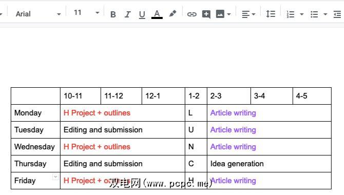 Google文档使创建每日计划者变得容易。您要做的只是设置一个5xX表格并填写您的任务。 (当然,如果要在计划者中加入周末,则可以使用7xX表格。)