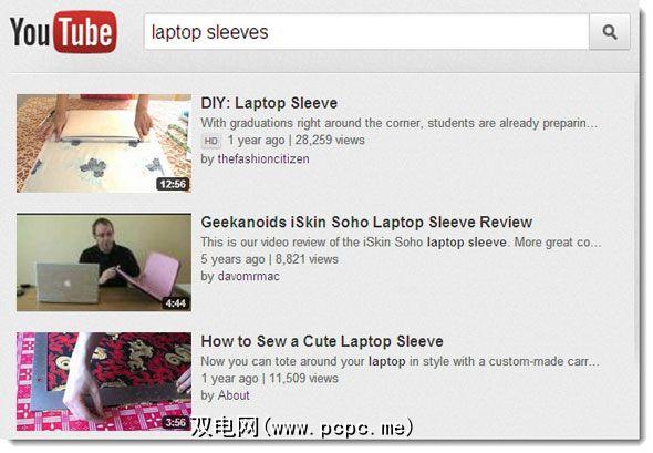 在搜索DIY时点击YouTube有关如何制作自己的笔记本电脑保护套的说明。仅搜索“袖子"的搜索就不会出现,因为它将带给您展示如何卷起衬衫袖子的视频;所以你必须更具体。使用“笔记本电脑袖子"进行搜索可获得600多个结果,尽管其中很多也是对商用袖子的评论。