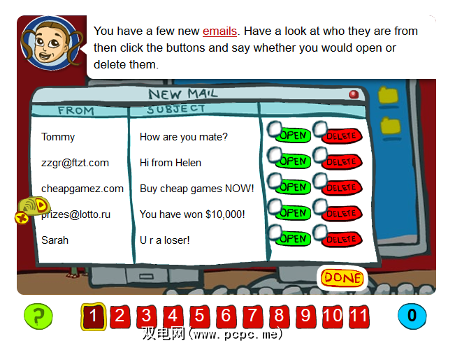 此测验的优点之一是每个页面都会出现以明亮的卡通风格进行格式化,以适合内容。例如,您可以查看四个虚构网站的缩略图以评估它们是否可以安全访问,或者浏览电子邮件收件箱以确定是否应该打开或删除邮件。