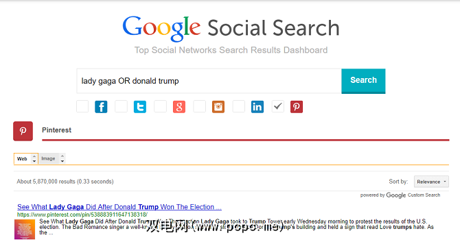 它可与六个网络一起使用。它们是Facebook,Twitter,Google Plus,Instagram,LinkedIn和Pinterest。您可以标记网络徽标旁边的复选框,以将搜索限制为特定站点。