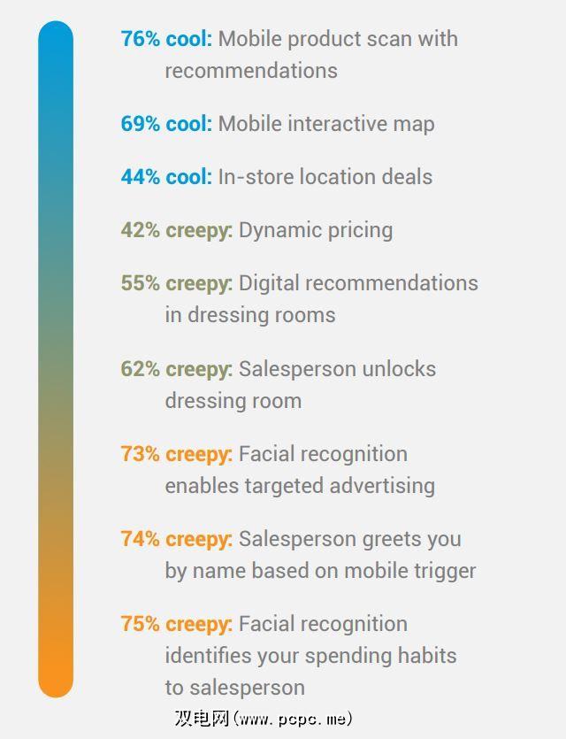 从这些结果中可以明显看出,隐私的侵蚀主要是人们认为“令人毛骨悚然"的东西,面部识别在该列表中居于首位。 。如果客户不喜欢某种类型的生物特征识别,那么商店就不太可能采用它,以免失去业务。