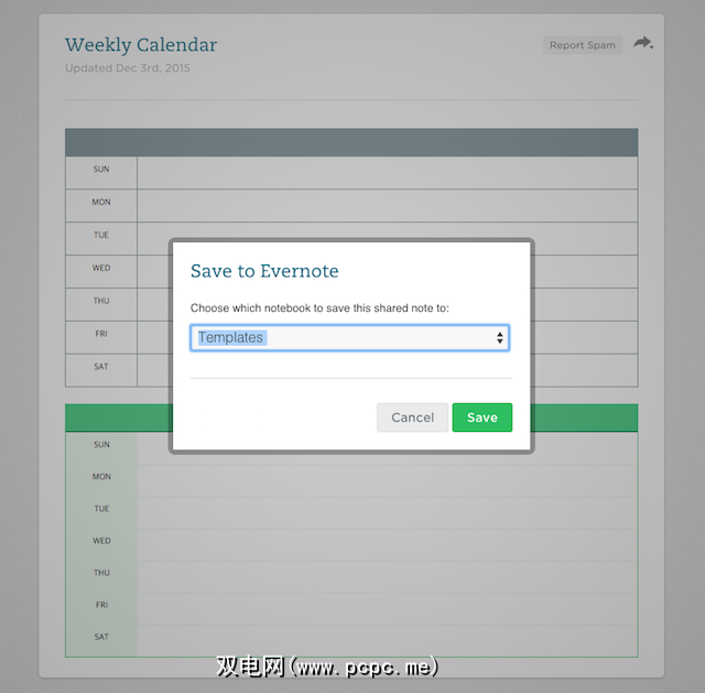 如果要使用Evernote作为计划者,则需要下载日历模板。 Evernote提供四种日历:每年,每月,每周和每天。选择要使用的日历类型后,单击保存到Evernote 按钮,然后选择Evernote笔记本。