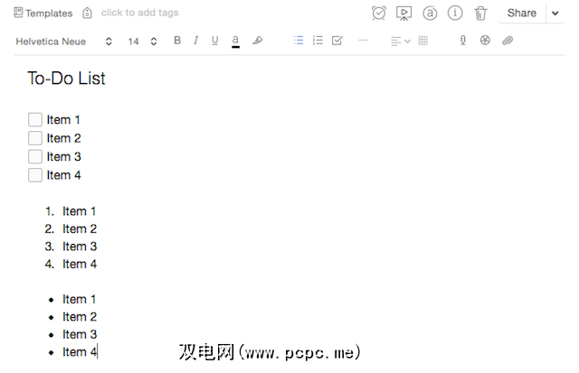 Evernote提供了许多种创建方法。自定义待办事项清单,杂货清单或您要定期创建的任何其他种类的清单,并保留信息记录。创建第一个音符时-您可以使用编号列表,项目符号或清单来将项目标记为已完成。
