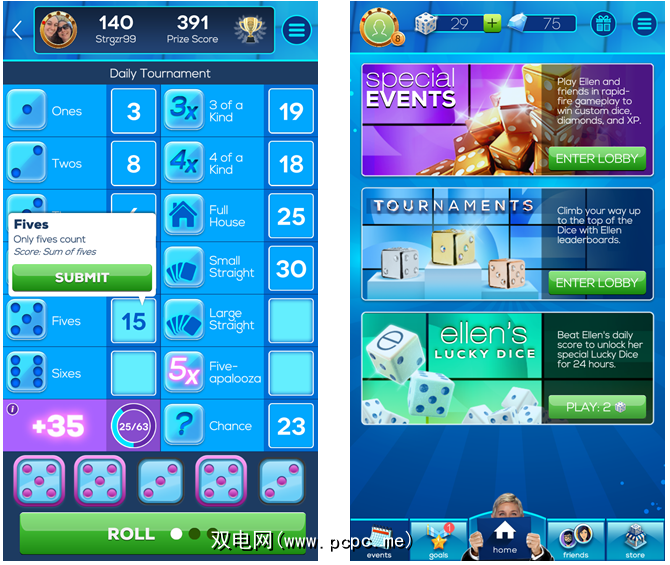 要获得有趣的 Yahtzee-风格的游戏,请查看 Dice with Ellen 。该游戏由Ellen DeGeneres主持,带来了令人愉悦的游戏玩法和幽默感。依次轮流滚动,获得三分之二的高分,以及满堂红和同类三分。