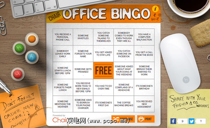 虽然有很多变化,但是ChairOffice上的Office Bingo卡为您提供了洗牌的选项。您可以在线玩,但不能与多个人一起玩。因此,只需打印卡,进行复印,然后将其分发给您的同事即可。看看谁首先在办公室进行的活动中得到宾果游戏。