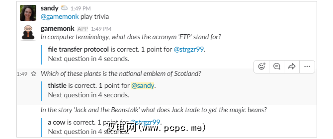GameMonk是Slack的不错选择,因为您可以玩三种不同的游戏。在“类别"中,您必须在60秒内命名一个主题中的多个项目,并为每个正确答案赚取积分。在Giphy中,您必须猜测与看到的GIF和类别相关的主题标签。