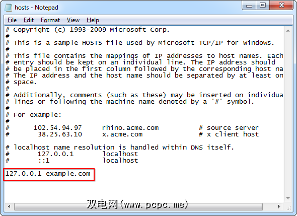 要阻止网站,请在下面添加一行,如下所示:主机文件的底部: