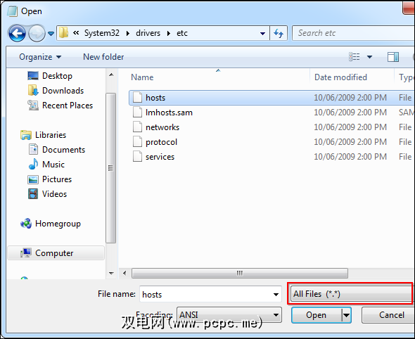 拥有后,在记事本窗口中单击文件和打开,然后浏览到 C:\ Windows \ System32 \ drivers \ etc 文件夹。单击窗口右下角的文本文件框,选择所有文件,然后双击主机文件。