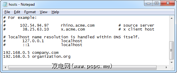 例如,如果您的Web服务器具有本地IP托管有company.com和organization.org网站的地址192.168.0.5,您可以将以下几行添加到本地计算机的主机文件中: