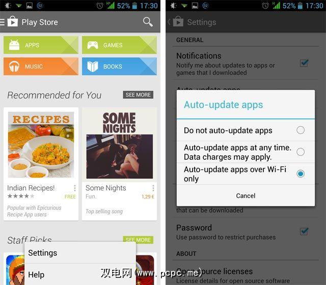 打开 Play商店,然后按手机上的菜单按钮可获取该应用的其他选项。转到设置>自动更新应用。您会在这里找到三个选项。不要自动更新应用程序(这使您可以手动管理所有事情),不要随时自动更新应用程序或通过Wi-Fi自动更新应用程序。