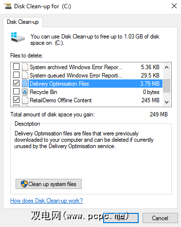 现在搜索磁盘清理并打开该应用。在向您显示可以删除的文件列表之前,它会花几秒钟的时间扫描您的设备。向下滚动,直到找到名为 Delivery Optimization Files 的条目。点击复选框,然后点击确定。 Windows将负责其余的工作。
