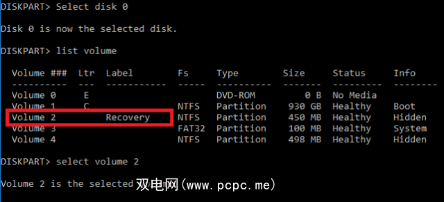 您将看到磁盘上所有卷的列表,包括恢复分区。键入选择卷X (用正确的数字替换 X ,在我的机器上是卷2)。