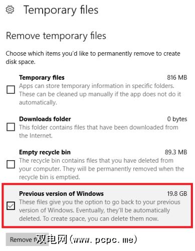 最后,选中 Windows的先前版本旁边的复选框,然后按 >删除文件。