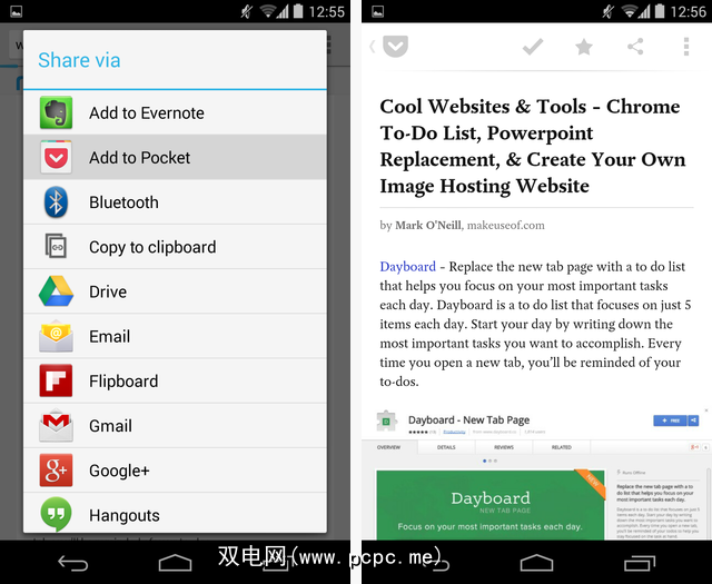 为此,我们建议使用Pocket。在手机上安装Pocket应用程序,在桌面Web浏览器上安装Pocket浏览器扩展程序。单击浏览器中的“口袋"按钮,当前页面将保存到您的口袋队列中。手机上的Pocket应用会自动下载该页面的文本和图像的离线副本,因此即使您没有Internet连接,也可以稍后阅读。 Pocket通常用于保存网页以供以后阅读,但是如果您习惯于打印出食谱和其他参考资料,则它可以替代打印。您还可以使用Android的共享功能将任何应用程序中的链接保存到Pocket。