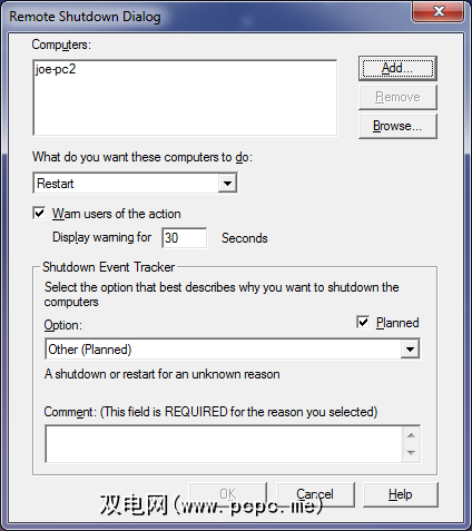 最后,确保已选择< strong>从下拉列表中重新启动,然后根据需要从其他选项中进行选择。例如,您可以在其他计算机上显示一条消息,警告即将重启。准备就绪后,单击确定以执行该过程。