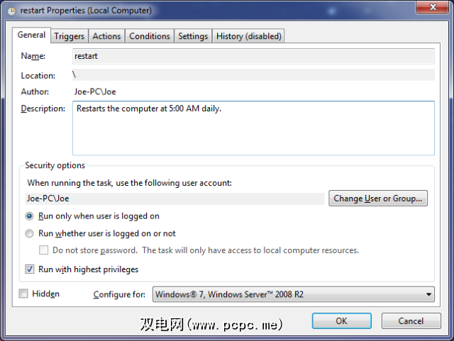 其次,为您的任务指定 Name ,然后在以最高权限运行的框。现在切换到触发器标签,然后点击新建…。如果要执行诸如使任务过期的操作,请从此处选择希望系统重启的频率并使用高级设置。点击确定。