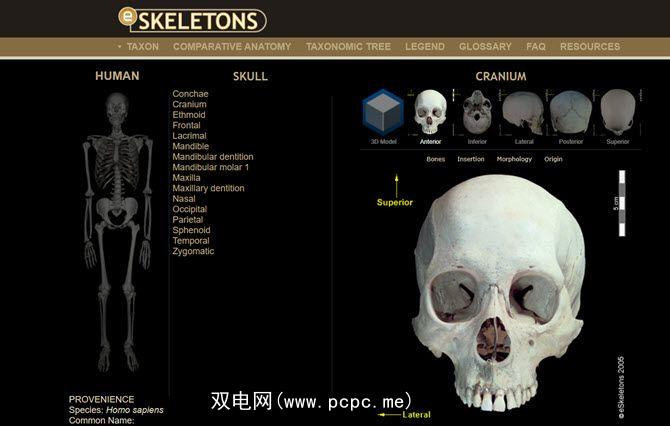 eSkeletons不仅与理解人体解剖学有关。它是一种交互式的比较工具,使学生可以查看人类和非人类灵长类动物的骨骼,并从该站点的解剖数据库中了解有关它们的更多信息。