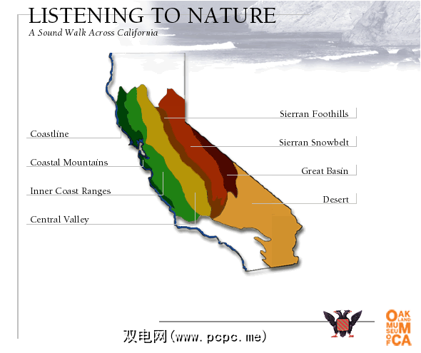 加利福尼亚奥克兰博物馆设有一个图书馆的声音。从他们的收藏中,他们编制了横跨加利福尼亚的声音之路,从海岸到内华达山脉,再到内华达山脉,再到大盆地。该网站要求Flash 4可以运行,您可以在此处下载。