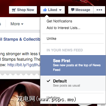 在喜欢按钮中,单击关注 >,您将看到两个选项出现。一个是先查看,另一个是默认。默认选项总是被选中,因此请单击“首先查看",以使该页面的新帖子显示在带有蓝色星号的新闻源顶部。