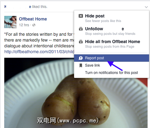 在这种情况下,您可以将帖子举报为“令人反感",这很容易做到。现在看这张马铃薯的照片,它可能会或可能不会使您想起某些身体部位。我很震惊!标准化!我会告诉孩子们什么?是时候教Facebook好友了。