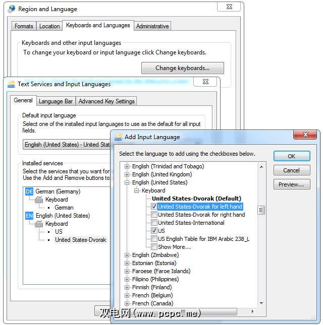 替代布局越极端,越令人沮丧,因此Dvorak布局是一个不错的选择。搜索区域和语言,然后切换到键盘和语言标签。点击更改键盘... 按钮,然后点击添加,浏览到英语(美国),展开键盘,并检查美国德沃夏克。最后,将默认输入语言更改为相应的键盘。