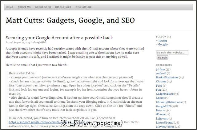 当然,您最好关注的另一个博客是Google SEO男人本人Matt Cutts。在他的博客中,他涵盖了从生产力最高标准,电视到电子产品和旅行的所有内容。但是,他的博客的SEO类别是最新的领域,也是世界各地的SEO爱好者分析最多的地方。