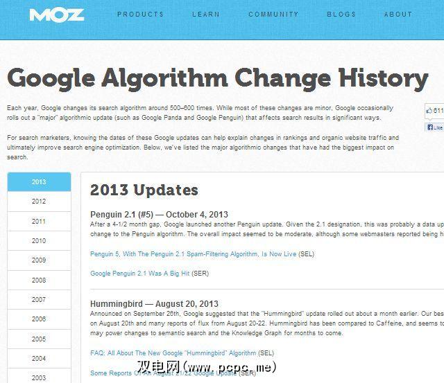 当Google修改其中任何一种算法,或者它们添加或删除了用于排名的“线索"数量时,不同网站与各种搜索词的相关性,有时可能会对访问者流量产生巨大影响。我每周要访问几次的网站之一,只是为了紧跟Google算法的最新变化,是MOZ Google算法更改页面。