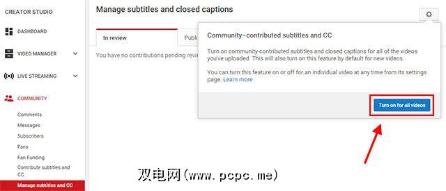 要实现这一目标,您首先需要翻转开关。进入您的 Creator Studio ,打开社区,然后单击管理字幕和抄送。在这里,点击右上角的 Cog图标,然后点击打开所有视频。