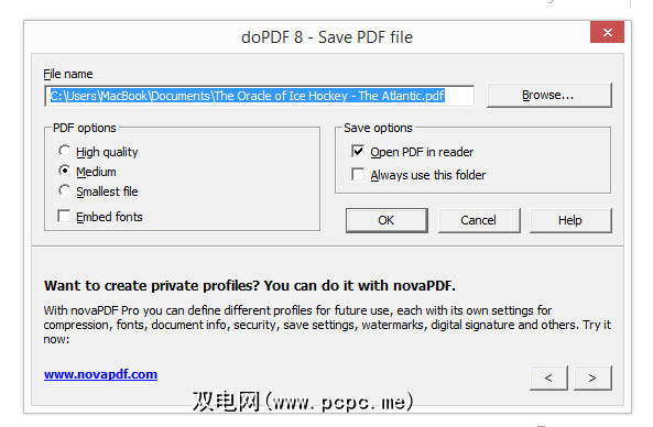 这里没有太多可抱怨的地方。如上所示,选项框中有一个很小的广告。该程序还默认不嵌入字体,这可能会导致生成一些看起来很有趣的PDF,但是可以通过单击复选框来解决。