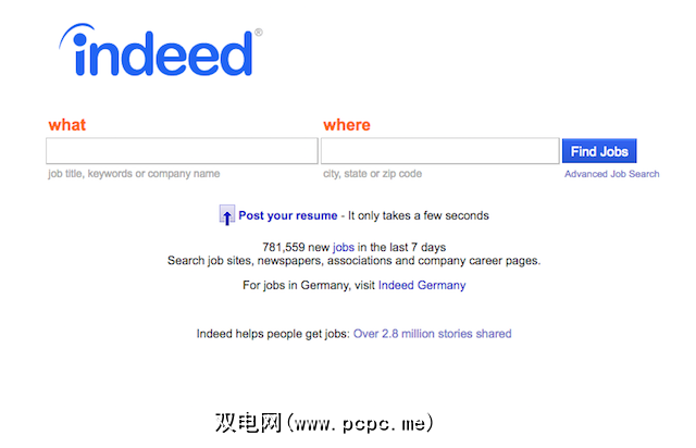 Indeed可能是周围最大的工作搜索引擎,但与Monster相比,它绝对更简单。没有大的浮华图形,没有多余的装饰-只是纯白色的背景,带有搜索引擎和可上传简历的链接。