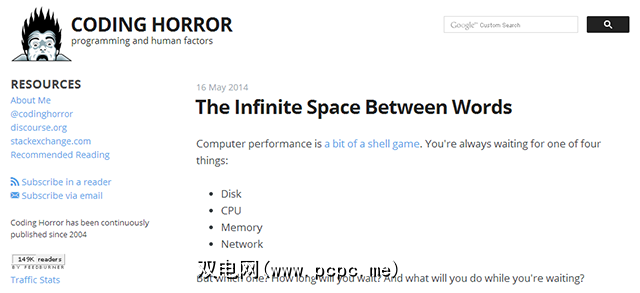 编码恐怖由经验丰富的网络和软件开发商Jeff Atwood撰写的半个人博客。您会发现大量与编程相关的帖子,他对某个特定主题的私人想法,他自己的研究摘要,甚至对新手和资深程序员的建议。