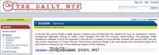 Daily WTF 是一个用户提交的博客,展示了在实际工作环境中见证的一些最差的编码实践。网站所有者批准并编辑提交的内容,以保持帖子之间的一致性,因此,不要让其中的“用户提交"部分将您拒之门外。