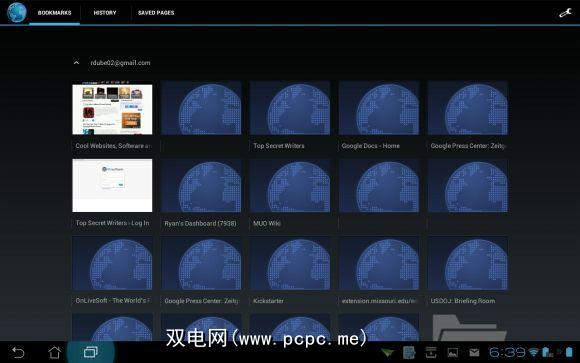 ICS本机浏览器上的书签页面还不错–整页的图标包含您所有已保存的书签。您会看到一个类似的页面来浏览历史记录,并看到任何“已保存的页面"以供离线阅读。