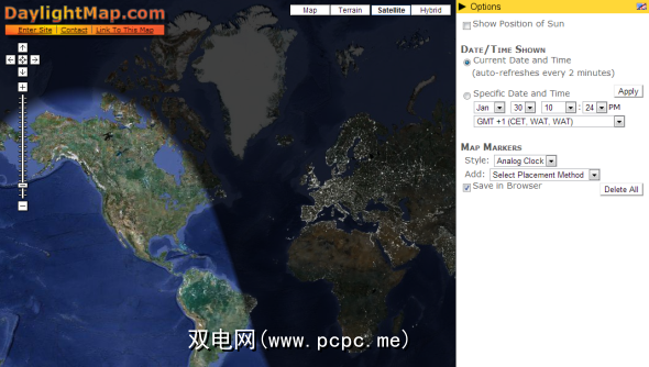 此简单的地图显示了地球上日光的当前分布。您可以通过右侧菜单跳至自定义日期和时间。 DaylightMap也可用于Android(名称为TerraTime)(并非免费)。 [不再可用]