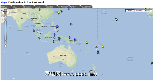 许多地图都基于天气事件。这一张地图描绘了地质事件,特别是过去一周的地震。通过顶部的标签,您可以快速放大不同的区域。左下方的图例说明了每个不同的颜色图钉代表什么;例如,红色大头针表示里氏震级超过6.0的地震。在图例旁边,您会找到相关的新闻和博客文章,以及来自Google的视频。