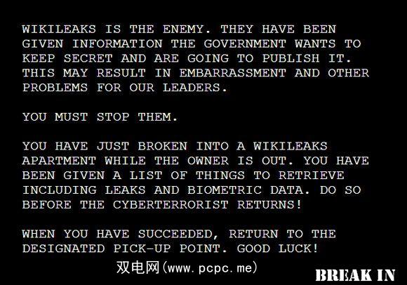 如果您是免费新闻工作者,那么您将喜欢这个关于Wikileaks攻击的暗讽游戏。这是一个角色扮演游戏,您扮演间谍任务,任务是从Wikileaks员工的公寓中检索泄漏的文档和生物特征数据。游戏就像寻宝游戏,您必须单击每个对象并找到线索。您还需要等待一个时钟(定时时间为999秒)。