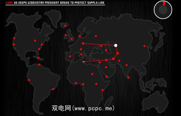 让我们继续关注Wikileaks及其对社交政治的影响,这款互动性稍差的游戏朱利安·阿桑奇(Julian Assange)撰写的论文“阴谋作为治理"的第二版。一开始很难理解,但是逐渐地您可以确定世界地图上的红点是城市,并且您的目标是创建一个在有限的时间内将所有这些城市互连的网络。基本上,您正在连接点,并在地图上呈现政治精英之间的阴谋互动的想法。游戏的背景是阿桑奇(Assange)的文章,它还散布着维基解密新闻项目,您可以暂停阅读它们。