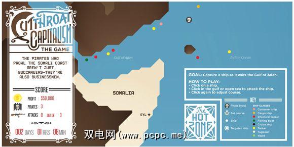 该游戏嵌入在《连线》中。 com的网站,该网站通常不是游戏网站。游戏的主题是亚丁湾附近的海上海盗活动,这一活动一直持续到今天。您是作为“另一方"的海盗指挥官,他必须抓住船并成功谈判赎金。这款游戏的设计精美且令人上瘾。