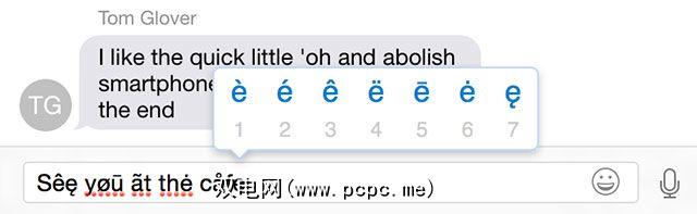 要在键盘上访问带重音符号的字符,以便您可以正确键入café或über之类的单词(或惹恼您的朋友),只需按住字母,直到要显示的重音符号,然后按与要应用的重音符号关联的数字即可。