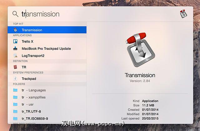 Spotlight很聪明,它了解您最常使用的应用程序-因此,即使该查询有大量搜索结果,打开``传输''仅要求我在选项出现之前输入``Tr''即可。与在Mac上打开应用程序,文件或文件夹的任何其他方法相比,此方法的传递速度要快得多。