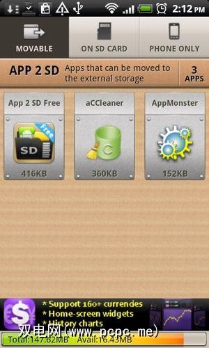 Froyo支持将应用程序移动到SD卡,但是在帮助您计划要移动的应用程序方面做得不好。使用Android界面,您可能会轻易错过手机上的大型应用程序,因为您没有意识到可以将其移至SD卡。如果您使用专用的App2SD应用程序,则会清楚地看到可以移动的应用程序和已经移动的应用程序。