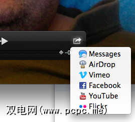 “播放/暂停"按钮旁边的是“ 共享"按钮,它看上去像一个盒子里出来的小弯曲箭头。单击该按钮,您将看到可以通过多种方法发送视频奇迹。对于YouTube,Vimeo,Facebook或Flickr,您需要使用凭据登录,或者访问系统偏好设置> Internet帐户。