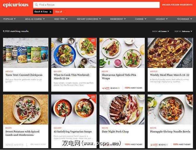 Epicurious是所有菜谱中最受欢迎的食谱网站之一。孔德纳斯特(Conde Nast)网站上有一个完整的章节,专门介绍快速简便食谱。您可以向下滚动食谱列表,该列表始终每个月都与新食谱保持同步。