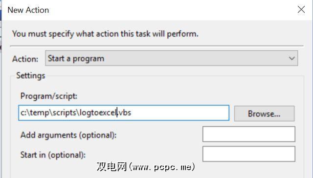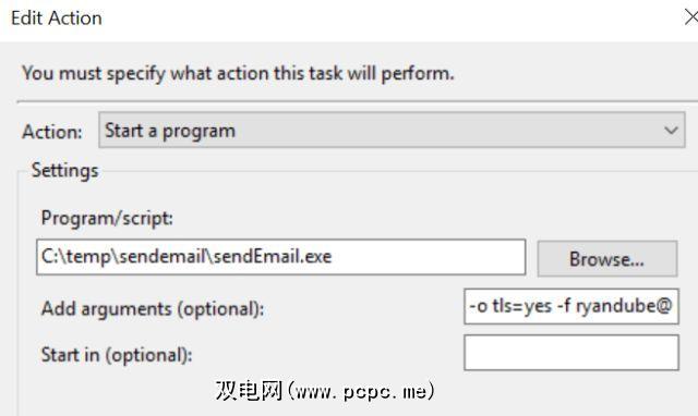 操作标签是发生魔术的地方。在这里,您将告诉任务计划程序运行sendEmail.exe(无论保存位置如何),然后在添加参数(可选)字段中输入所有其他参数。