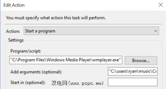 您会注意到,您需要提供wmplayer.exe的完整路径(使用浏览按钮将更加方便)。然后,在添加参数(可选):字段中,以引号提供音乐文件的完整路径。