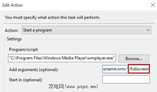 执行此操作的一种方法与上面的音频计划任务完全相同,但使用全屏选项: wmplayer “ c:\ videoname.wmv" / fullscreen