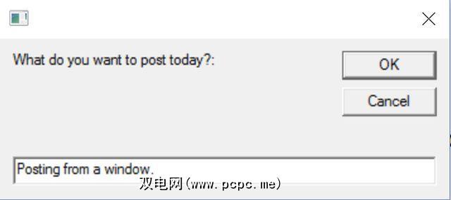 现在,想想如果您甚至不必打开Facebook即可发布,那将有多酷-只需设置一个即可。 vbs脚本就像您在日记中所做的一样,但是它询问您要发布的内容,并让您的计算机为您完成Facebook的发布!
