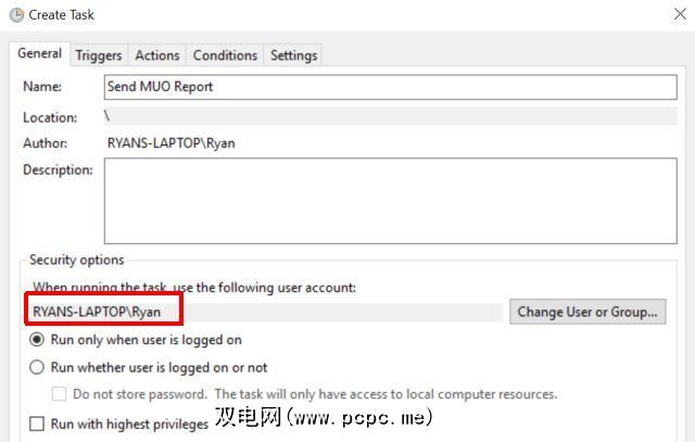 下一步,命名您的任务。在这种情况下,我将其称为“发送MUO报告"。它也将以我的用户帐户运行,但是如果您在PC上有多个用户,并且他们想要自己安排的任务,请确保选择了正确的用户。