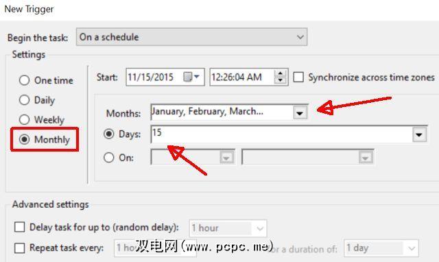 在 Triggers 标签,设置您希望发送电子邮件的时间表。在此示例中,我每个月要在每月的15号进行操作。