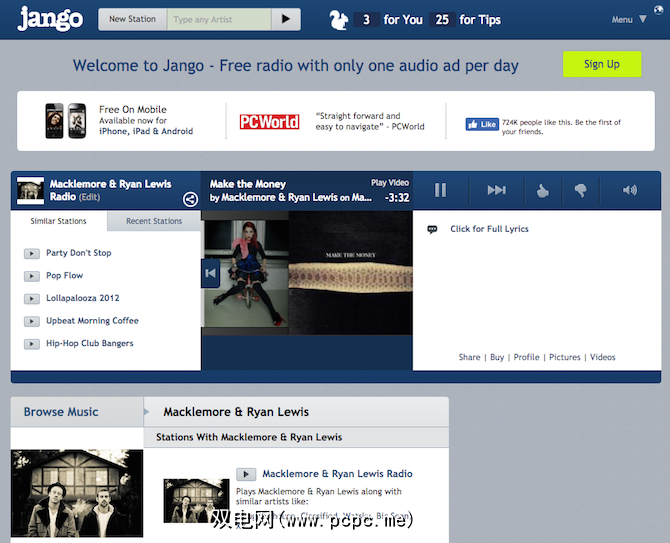 另一项无限制的流媒体服务,提供移动应用程序,体裁和艺术家广播,但Jango并非完全没有广告。也就是说,您每天获得的只是一则广告,因此绝对值得在此列表中占据一席之地。通过搜索您喜欢的艺术家来创建新电台,或按流派或年代浏览建议的电台。您还可以“禁止"特定的歌曲,以使它们不会出现在您的广播电台中,但您不能在歌曲中跳到要收听的歌曲中的特定位置。